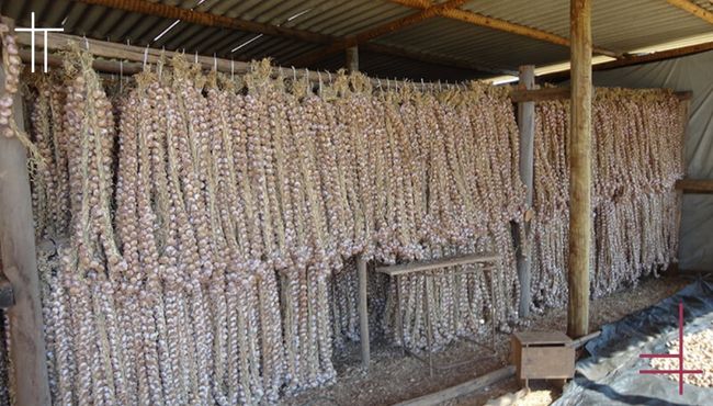 A cura bem feita é como “selar” o alho para sua conservação: ela prepara o produto para manter qualidade até as próximas etapas de beneficiamento, armazenamento e venda.