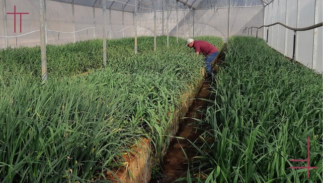 - Inspeções periódicas eliminam imediatamente plantas que apresentem sintomas de infecção viral, como estrias amareladas e amarelecimento foliar, deformidades nos bulbos ou sinais de deficiência nutricional.