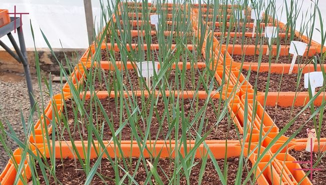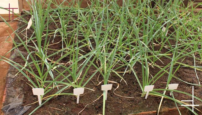 linha 1, os da planta 2 na linha 2, e assim por diante, todos devidamente identificados. Cada linha representa uma família derivada de um único bulbo. No ano seguinte, as melhores plantas de cada família são novamente selecionadas e replantadas.
