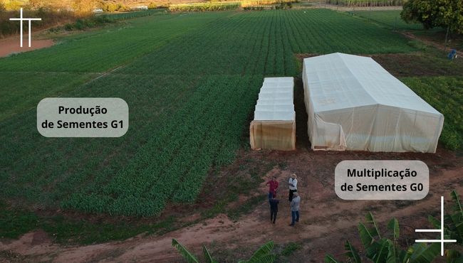 A semente genética é multiplicada em telados antiafídeos, conhecidos como matrizeiros. O cultivo é realizado em canteiros suspensos com substrato esterilizado, sob rigoroso controle fitossanitário, garantindo a produção em escala e ser formalmente disponibilizada para os parceiros da Embrapa, para produção em larga escala da semente básica, conhecida por G0.