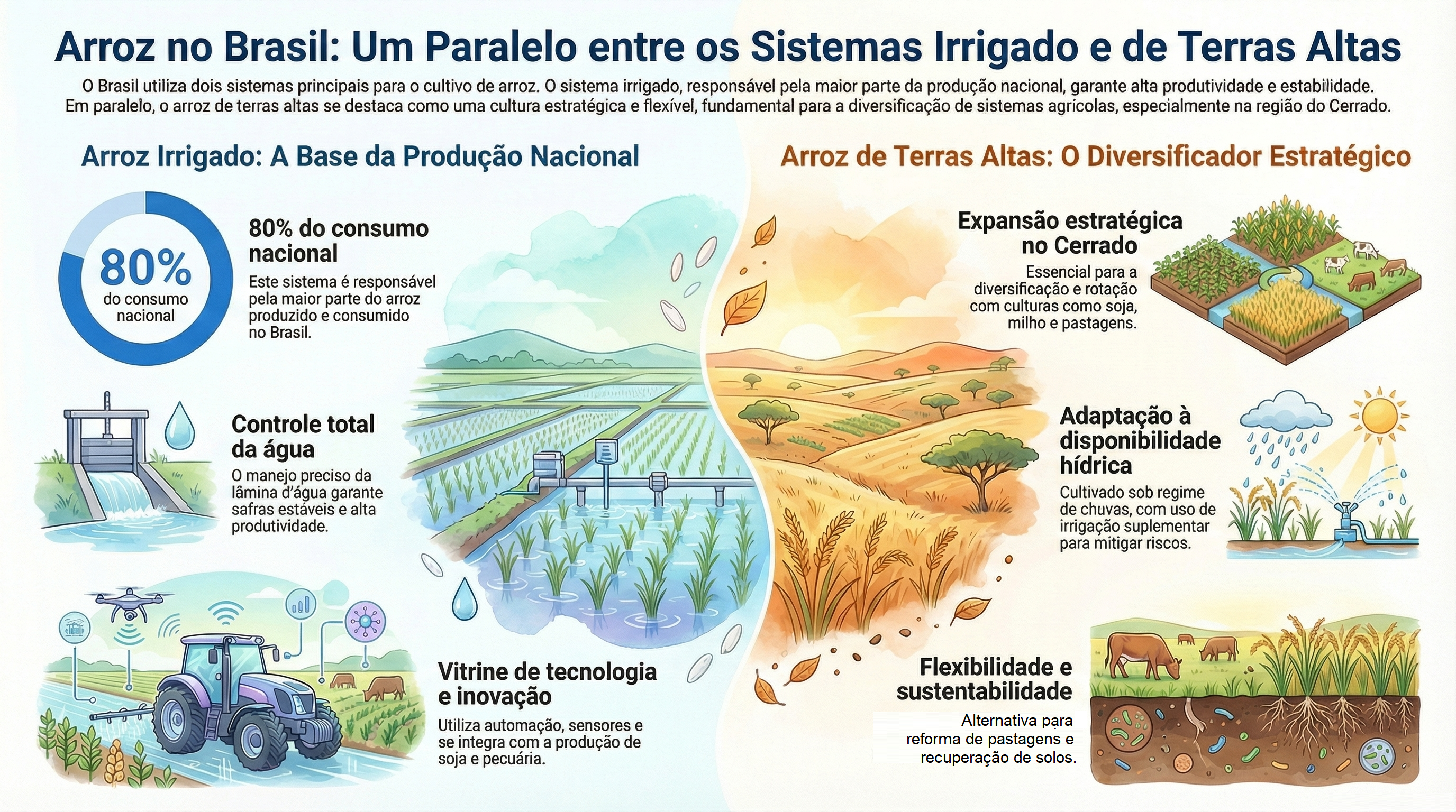 O arroz é um dos alimentos mais presentes na mesa do brasileiro e uma cultura estratégica para a agricultura nacional, movimentando cadeias produtivas que abrangem agricultores familiares, médios e grandes produtores, cooperativas, agroindústrias e diversos serviços especializados. Essa amplitude reflete a própria diversidade do cultivo no Brasil, realizado em ambientes irrigados, em terras altas e em sistemas especiais voltados a mercados diferenciados, cada qual com suas particularidades e desafios técnicos.
