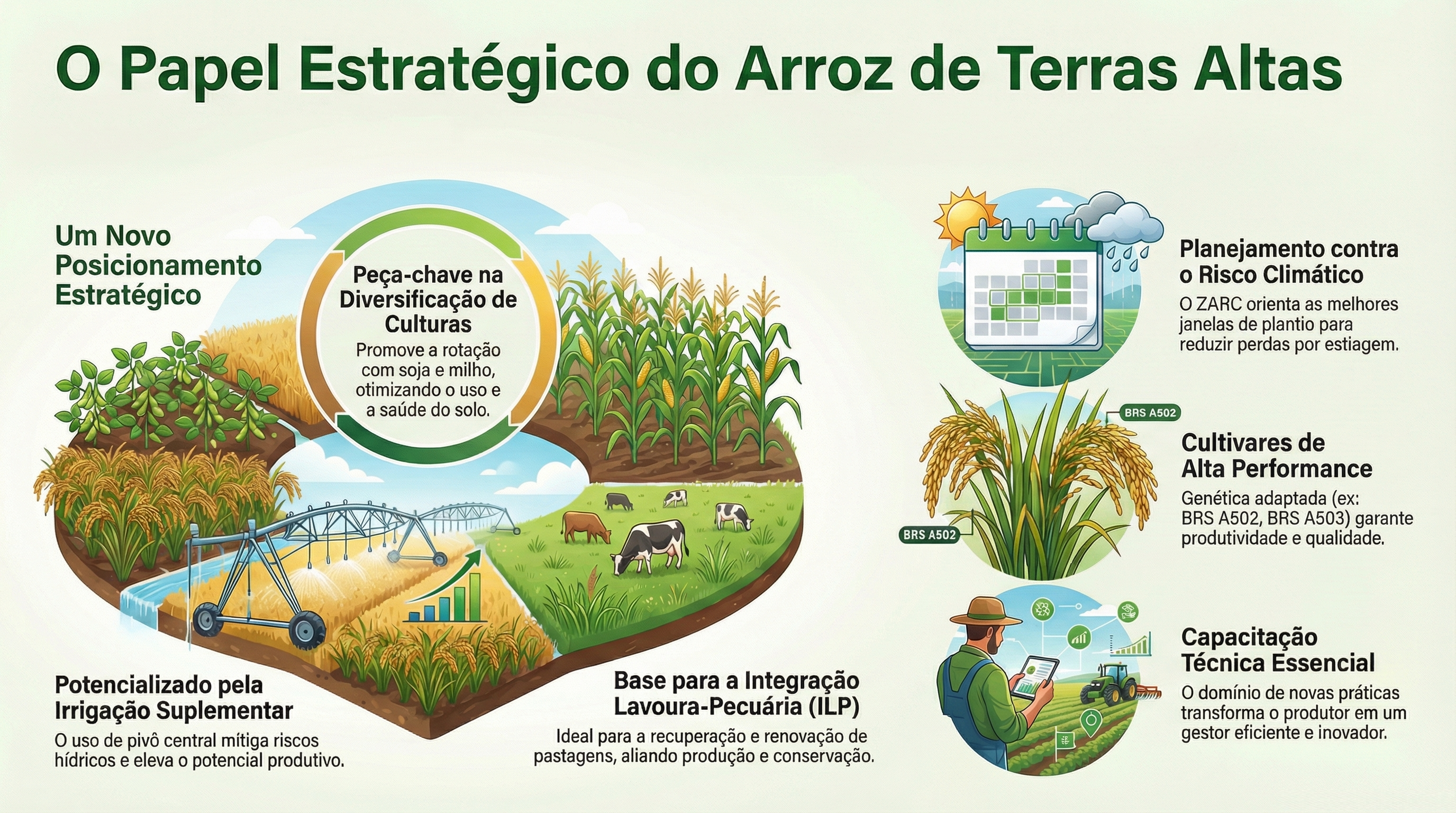 O arroz de terras altas é cultivado em áreas não irrigadas, sob regime de chuva natural, predominando nas regiões de Cerrado e em sistemas agrícolas diversificados. Esse sistema se caracteriza pela adaptação a condições de menor disponibilidade hídrica, maior integração com outras culturas e potencial de mecanização plena. A produção depende fortemente da escolha correta da cultivar e de práticas de manejo que favoreçam o uso eficiente de água e nutrientes. O cultivo de sequeiro vem se destacando pela sustentabilidade e pela possibilidade de uso em rotação com soja, milho e pastagens, ampliando as alternativas econômicas dos produtores.