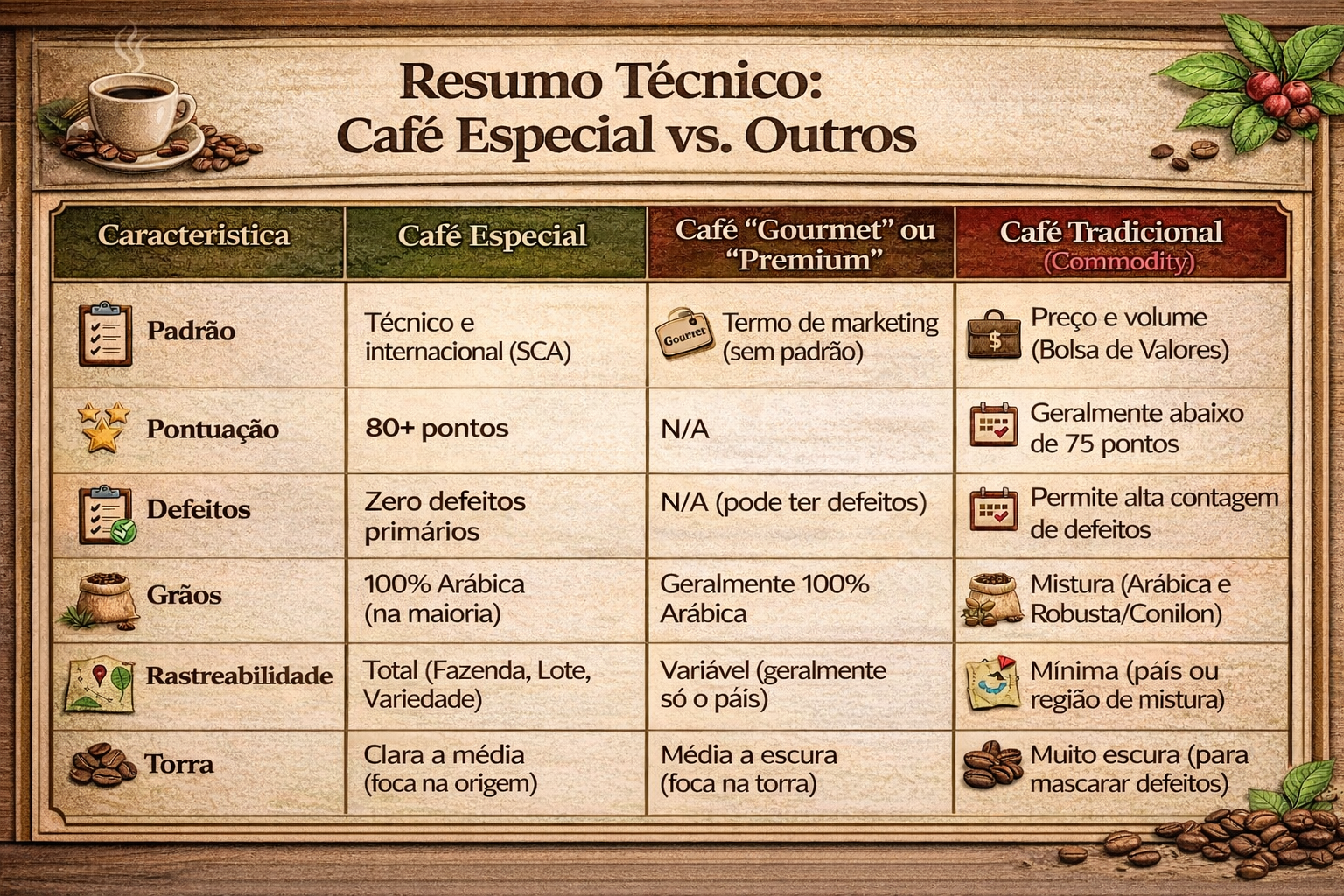 Embora a pontuação e os defeitos sejam a definição técnica central, o conceito de "café especial" engloba toda a cadeia, exigindo excelência em cada etapa: