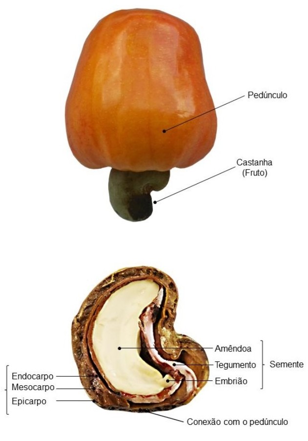 O verdadeiro fruto do cajueiro é a castanha, formada pelo pericarpo (casca) e pela semente, que é dividida em três partes: tegumento (película), embrião e amêndoa (parte comestível). A castanha-de-caju deve ser beneficiada para a retirada da amêndoa para consumo.