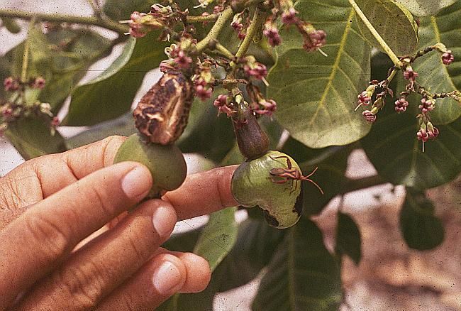Atacam os frutos novos, quando pequenos eles ficam murchos e se tornam pretos, quando maiores podem assumir aspectos mumificados e em castanhas permanecem as manchas até depois da castanha seca. Esse ataque resultam em perdas quantitativas aos pseudofrutos, castanhas e amêndoas