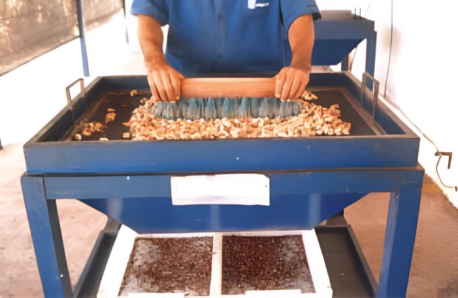 Nos dois processos pode-se obter até 75% de amêndoas totalmente sem película. As amêndoas parcialmente despeliculadas devem passar por raspagem manual, com uso de facas ou estiletes. Amêndoas duras ou de difícil despeliculagem devem retornar à estufa, para uma nova secagem.