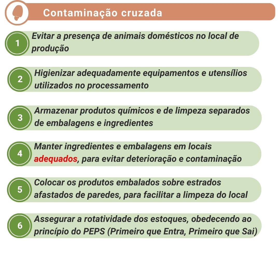 - Manter ingredientes e embalagens em locais adequados, para evitar deterioração e contaminação.