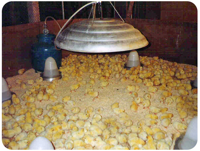 Logo após, instala-se no centro do círculo a campânula, com altura mínima de 60 cm da cama. Pode ser feita a forração parcial da cama com papel. Também são colocados os bebedouros e comedouros infantis.