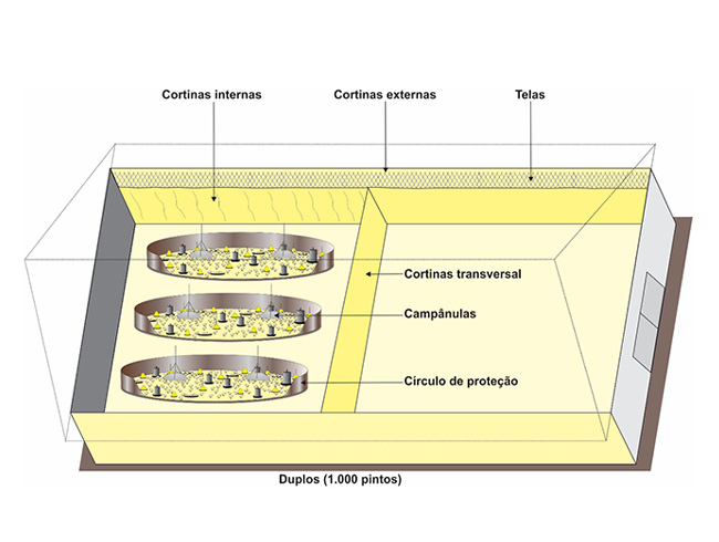 Em determinadas situações, é possível trabalhar com a redução da área a ser aquecida utilizando cortinas divisórias, o que facilita o manejo do ambiente na fase inicial das aves.