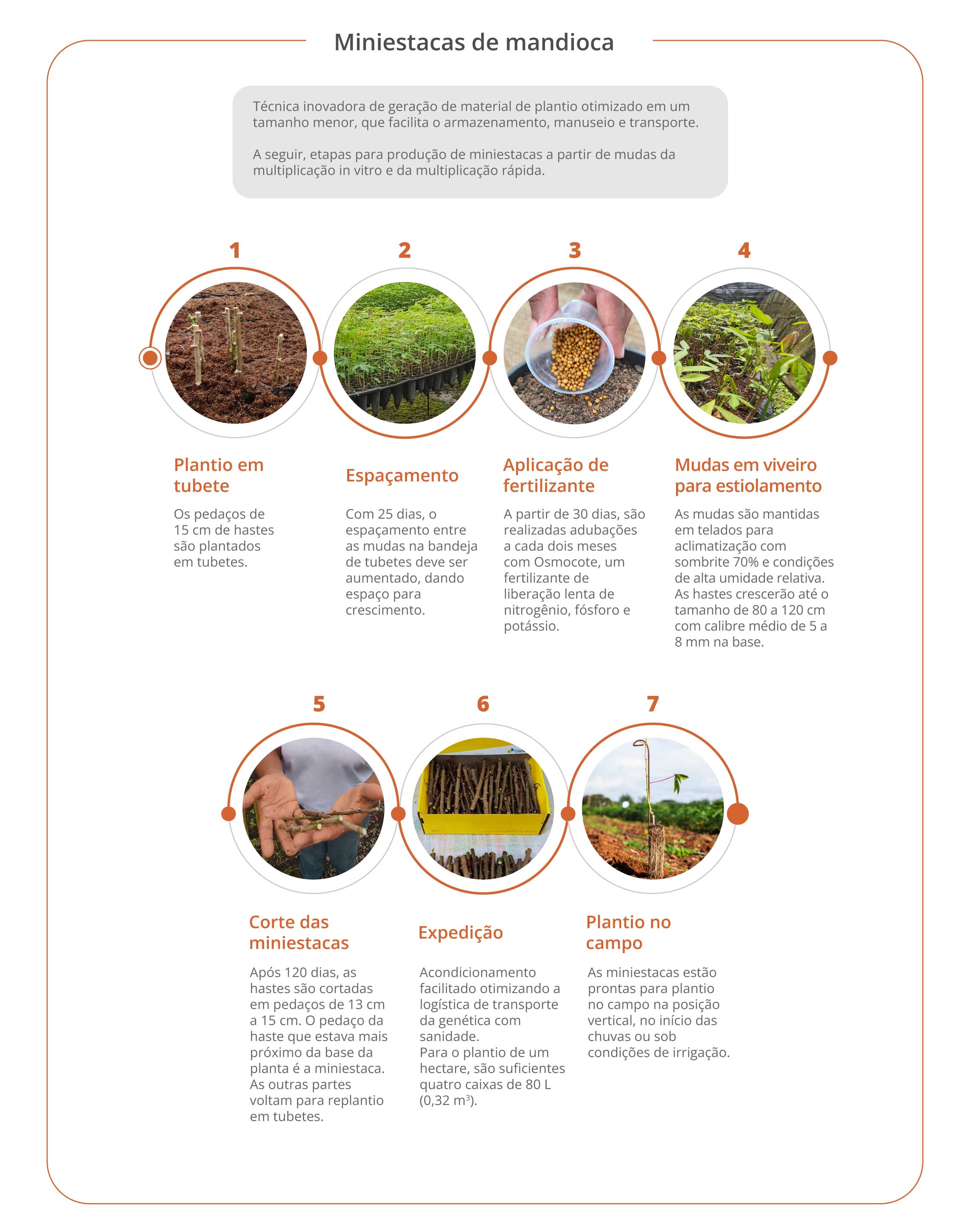 Outro meio de propagação da mandioca é utilizando miniestacas, que são similares às manivas tradicionais mas com um tamanho aproximadamente dez vezes menor. O volume reduzido das hastes facilita a logística de transporte e distribuição do material de plantio sem diminuir o rendimento da produção.