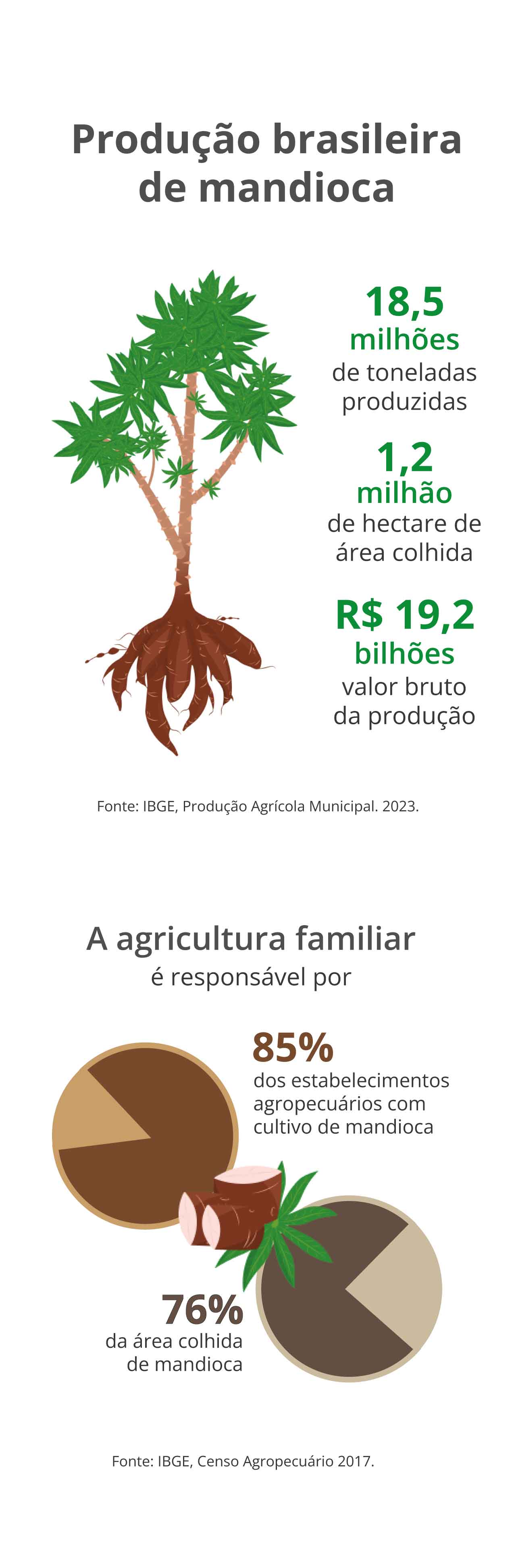 A mandioca tem forte presença na agricultura familiar, sendo utilizada para subsistência, alimentação animal e fonte de renda para pequenos produtores por meio da comercialização da raiz. Dados do Censo Agropecuário 2017, o mais recente realizado pelo IBGE, revelaram que 90% das propriedades com cultivo de mandioca eram menores que 50 hectares. Além disso, a agricultura familiar representou 76% da área colhida com a cultura naquele momento.Encontrado na página: Aspectos econômicos