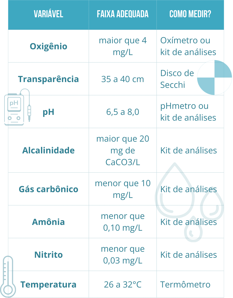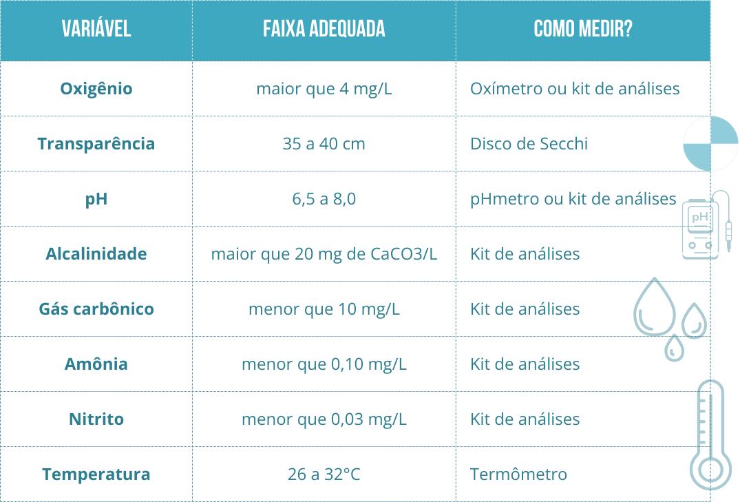1. Oxigênio (O₂) dissolvido : o oxigênio é utilizado na respiração dos peixes e necessário para a sua sobrevivência e crescimento. O oxigênio dissolvido deve estar acima de 4 mg/L e níveis baixos podem causar estresse e até mortalidade, sendo importante monitorar especialmente durante a manhã, quando os níveis tendem a ser mais baixos.